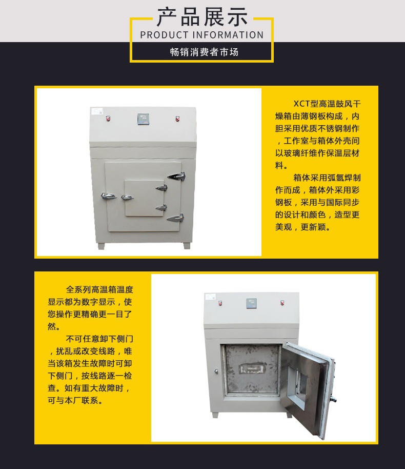 1.XCT型高溫鼓風干燥箱由薄鋼板構成,內膽采用優質不銹鋼制作,工作室與箱體外殼間以玻璃纖維作保溫層材料。